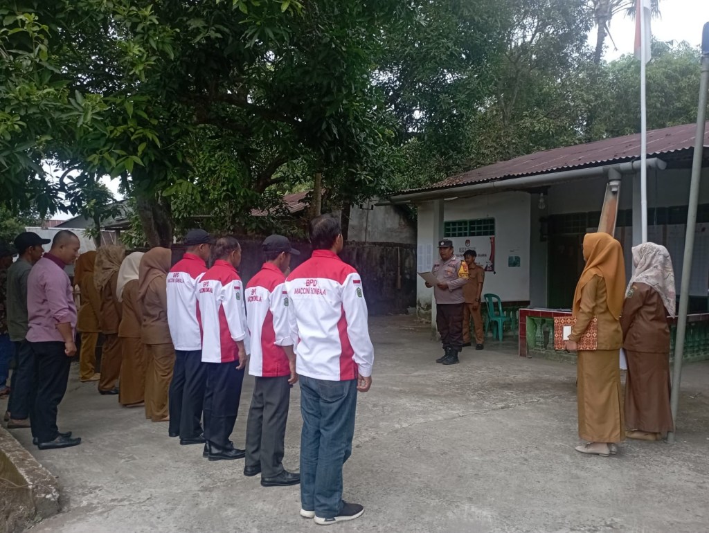 Bhabinkamtibmas Desa Maccini Sombala, Kecamatan Galut, Bripka Muh. Said didaulat sebagai pemimpin Apel Pagi Staff Desa Maccini Sombala. Senin, 2/7/2023.