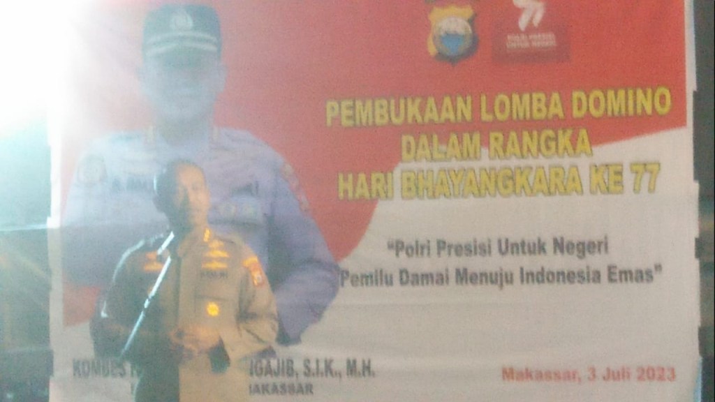Kata sambutan kapolrestabes kota Makassar, Dalam pembukaan Lomba Domino, Dalam Rangka, Hari Bayangkara ke 77. Makassar tgl 3 juli 2023, ada pun acara pertandingan domino di Halaman parkir kapoltestabes, Kapolres kombes pol Mohammad Ngajib ,S,I,K,M ,H, Pak kapolres uji tanding, sama juara satu pertandingan domino di kapolda, beberapa hari yg lalu