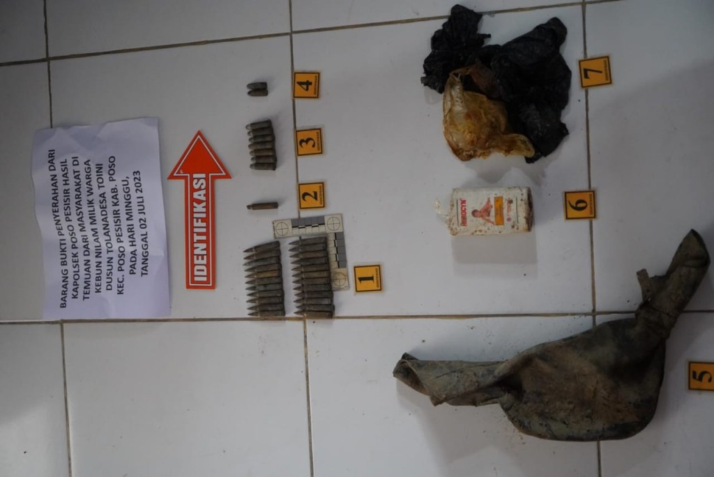 Kapolsek Poso Pesisir Iptu Andi Cakra membenarkan penemuan barang atau benda berupa amunisi senjata api masih aktif sebanyak 33 butir dengan rincian 23 butir amunisi tajam kaliber 5,56 mm, 1 butir amunisi karet kaliber 5,56 mm,7 butir amunisi tajam kaliber 3,8 mm, 2 butir amunisi tajam kaliber 9 mm,potongan ban dalam sebuah mobil,potongan kantong plastik, dan kemasan plastik bedak merk Herosin, semua barang tersebut kami serahkan ke Unit Identifikasi Polres Poso.Urai Kapolsek.