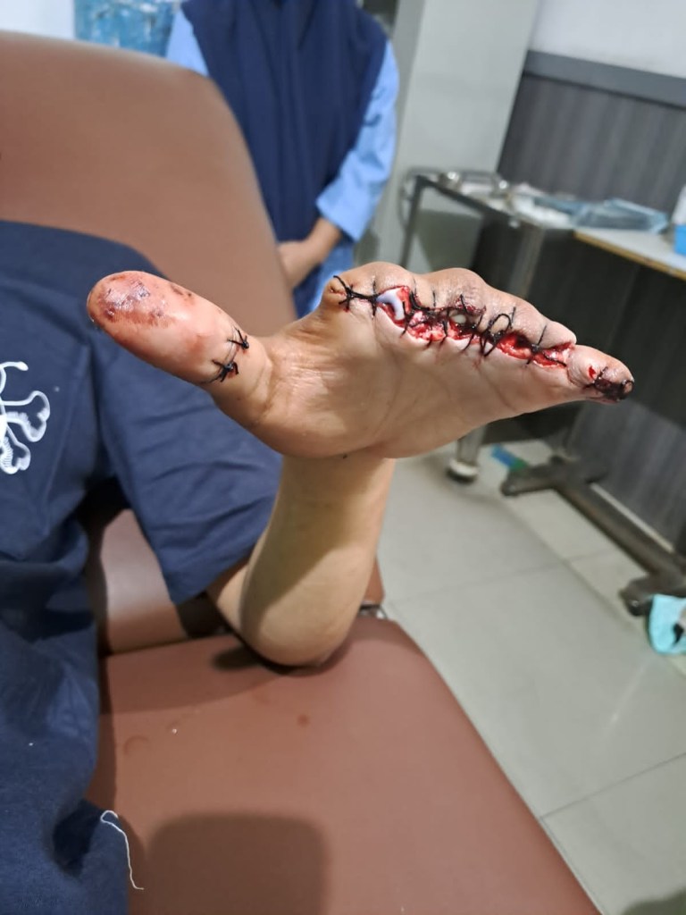 Hingga saat ini Korban masih di rawat di rumah sakit samaritan dengan kondisi 4 ( empat) jari tangan kiri putus.