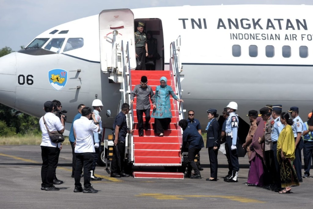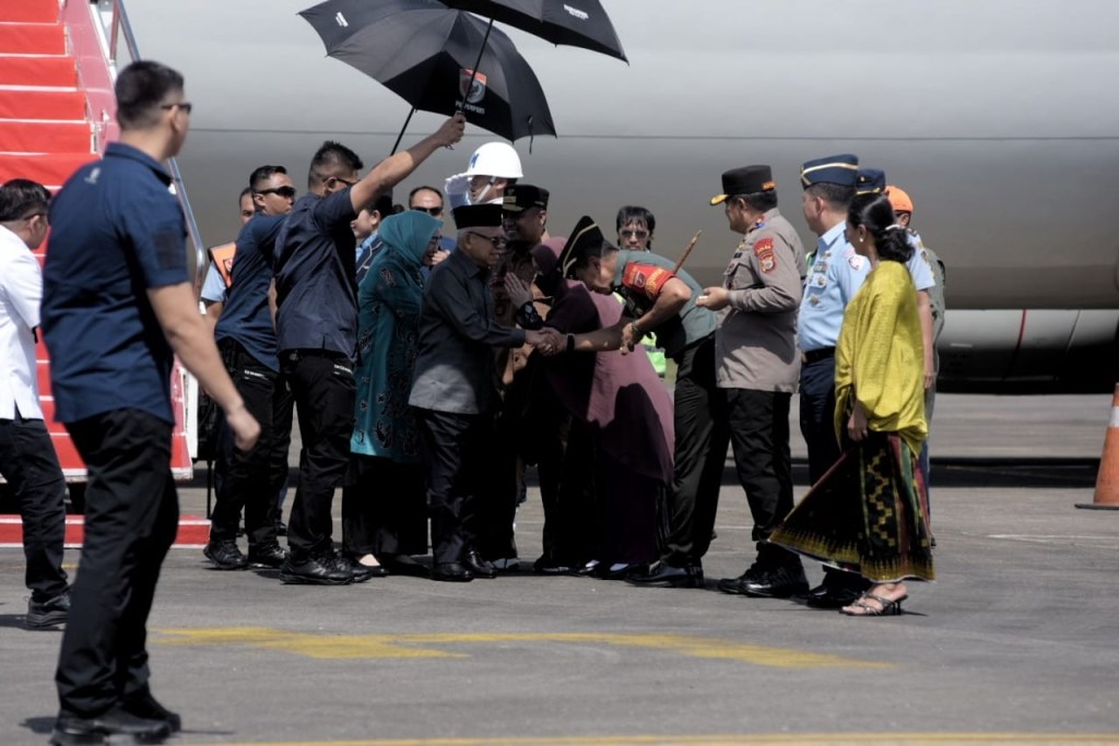 Tiba di Bandara, K.H. Ma’ruf Amin yang didampingi istri, Ibu Hj. Wury disambut bahagia oleh Pangdam XIV/Hasanuddin selaku Pangkogasgabpad Pam VVIP bersama Gubernur Sulsel Andi Sudirman Sulaiman, S.T., Kapolda Sulsel Irjen Pol. Drs. Setyo Boedi Moempoeni Harso, S.H., M. Hum., beserta sejumlah pejabat utama (PJU) TNI dan Polri yang berada di wilayah Kota Makassar.