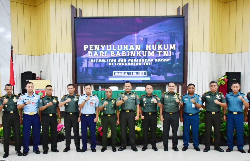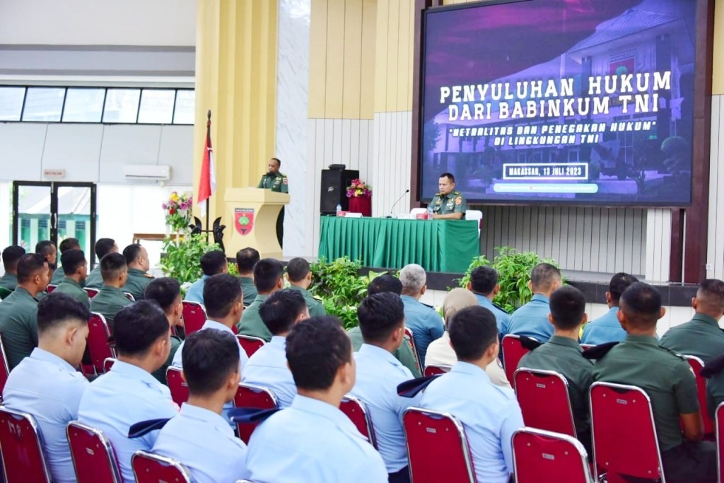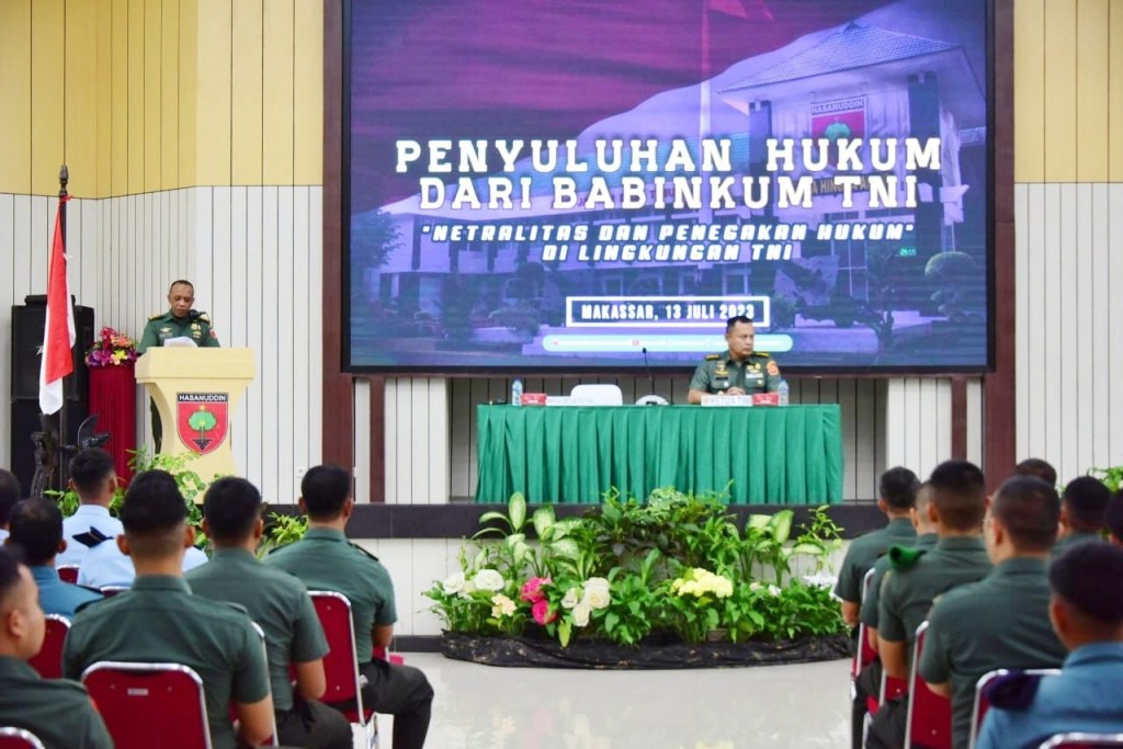 Kepala Hukum Kodam (Kakumdam) XIV/Hasanuddin Kolonel Chk Bahrun Taslim, S.H., mewakili Pangdam XIV/Hasanuddin menghadiri kegiatan Penyuluhan Hukum (Luhkum) dengan tema “Netralitas dan Penegakan Hukum di Lingkungan TNI”, bertempat di Balai Pertemuan Hasanuddin (BPH) Makodam, Kota Makassar. Kamis (13/07/2023).