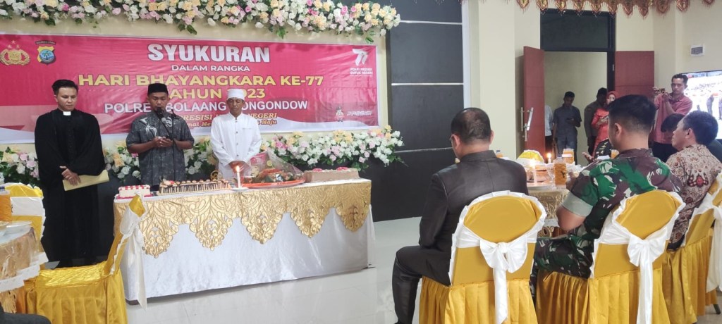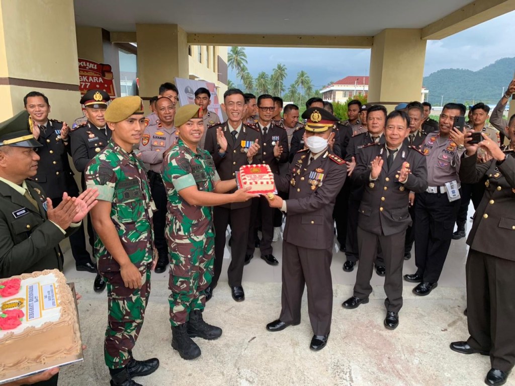 Komandan Batalyon Armed 19/105 Trk Bogani Letkol Arm Edi Yulian Budiargo, S.Sos., M.Han. beserta perwira staf dan personel Yonarmed 19/105 Trk Bogani hadri Syukuran dalam rangka Hari Bhayangkara ke-77 di Polres Polres Bolaangmongondow dengan membawa kue ulang tahun yang diberikan secara langsung kepada Kapolres Bolaangmongondow AKBP Slamet Ramelan di Jl. Trans Sulawesi, Lolak, Kabupaten Bolaangmongondow, Sulut. Sabtu kemarin (01/07/23).