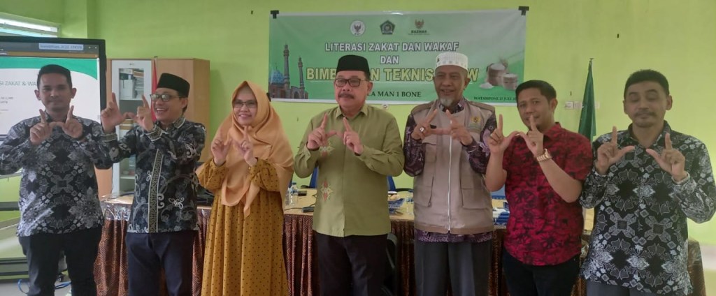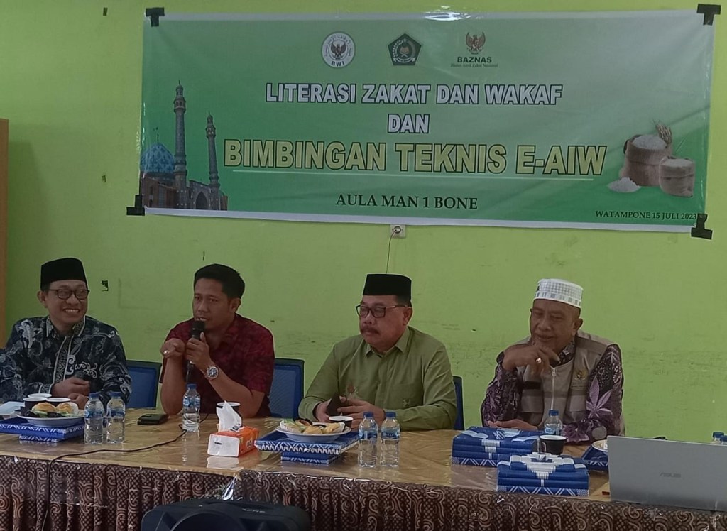 Kementerian Agama Kabupaten Bone melalui Penyelenggara Zakat dan Wakaf, bekerjasama dengan Badan Amil Zakat Nasional (Baznas) Kabupaten Bone, menggelar kegiatan Literasi Zakat dan Wakaf dan Bimbingan Teknis (Bimtek) Pendaftaran Tanah Wakaf Digital (E-AIW), di Aula MAN 1 Kabupaten Bone, Jl. Manurunge Tanete Riattang Barat, Sabtu, 15 Juli 2023.
