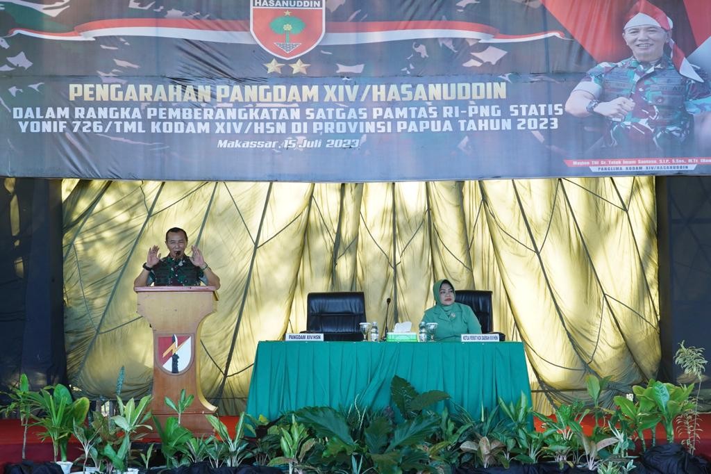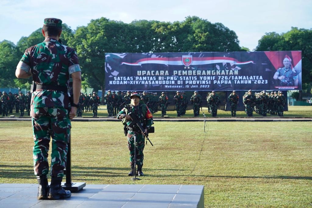 Pangdam XIV/Hasanuddin Mayjen TNI Dr. Totok Imam Santoso, S.I.P, S.Sos, M.Tr (Han)., memberangkatkan Satuan Tugas (Satgas) Pamtas Batalyon Infanteri (Yonif) 726/Tml (Tamalatea) yang digelar dalam upacara pemberangkatan, bertempat di lapangan Mako Yonif Raider 700/WYC. Sabtu (15/07/2023).