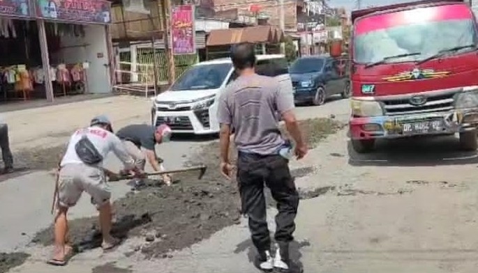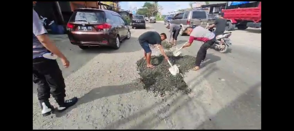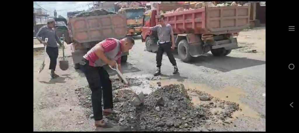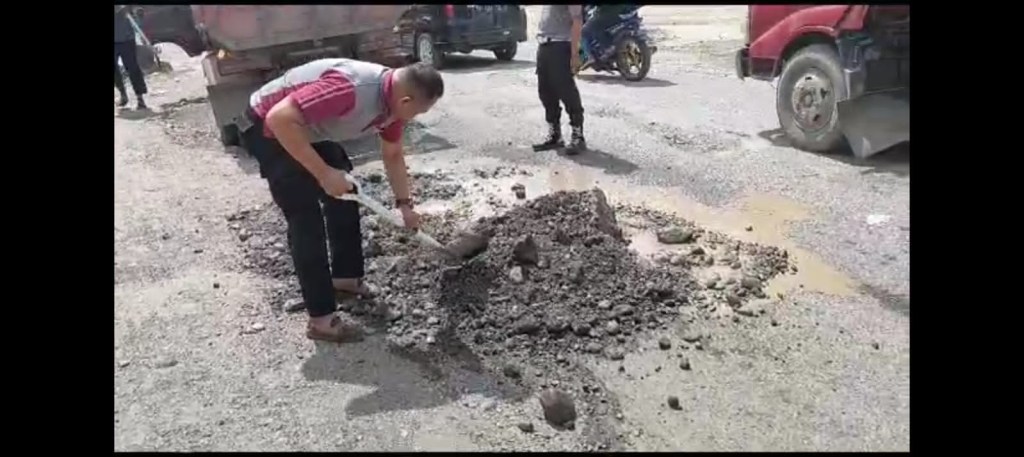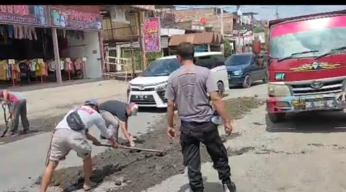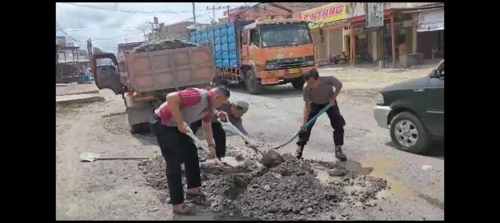 Kebersamaan Aparat Kepolisian bersama warga masyarakat dengan ikut membantu bersama warga masyarakat setempat terlihat semangat dengan memberbaiki jalan dengan cara bergotong royong