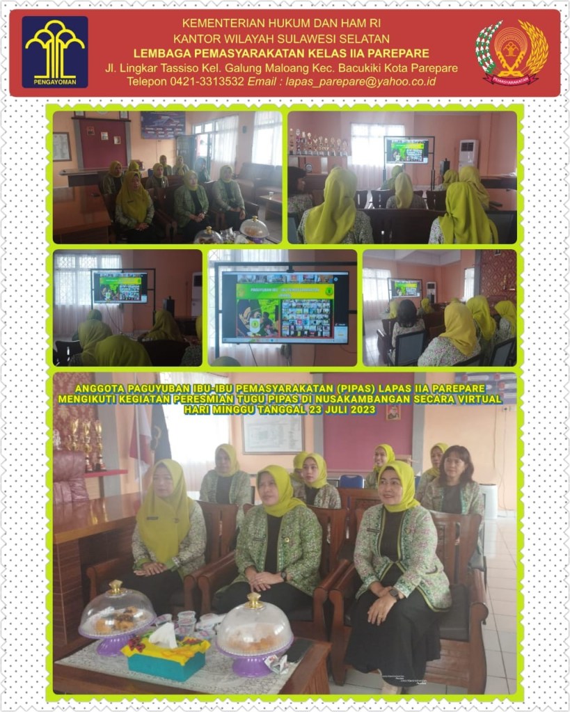 Bertempat di ruang Lapas IIA Parepare anggota Paguyuban Ibu-ibu Pemasyarakatan (PIPAS) Lembaga Pemasyarakatan Kelas IIA Parepare mengikuti kegiatan peresmian TUGU PIPAS di Nusakambangan secara virtual. Dasar pelaksanaan Surat Penasehat Utama PIPAS Nomor : 27/SEKRE/PIPASPUSAT/VII/2023 terkait acara Peresmian Tugu PIPAS sebagai bentuk pengkhidmatan eksistensi dan komitmen PIPAS dalam mendukung kemajuan pemasyarakatan Indonesia.