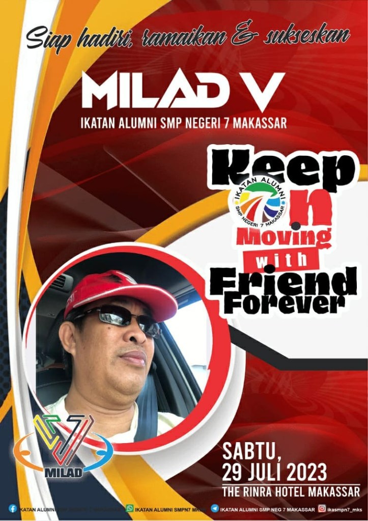 Seperti Ikatan Alumni SMP.Negeri.7. Makassar Provinsi Sulawesi-Selatan rencananya akan mem peringati Milad ke V ( Lima ) di The Rinra Hotel Makassar. Jalan Tanjung Bunga.Nomor.2. Panambungan. Sul-sel. Puncak merayakan acara Milad akan di rayakan pada hari.Sabtu.29-Juli-2023.