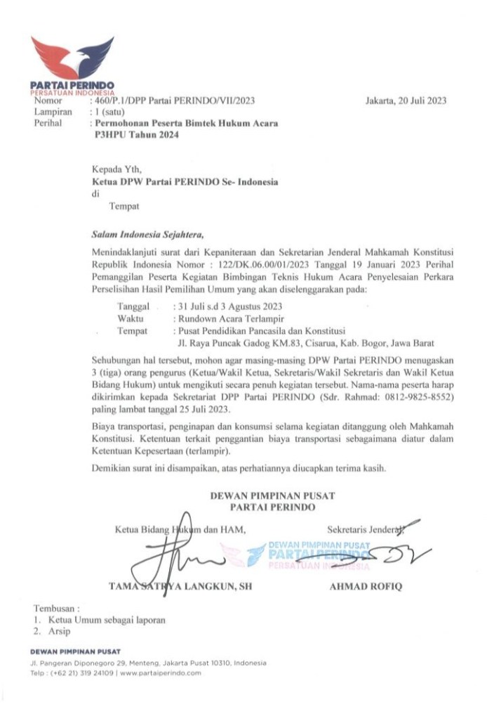 Sebanyak 150 orang peserta dari seluruh DPW dan DPD partai Perindo se Indonesia akan mengikuti Diklat sengketa hukum pemilu 2024 di Balai Diklat Mahkamah Konstitusi di Bogor di mulai tanggal 31 sampai tanggal 3 Agustus 2023.