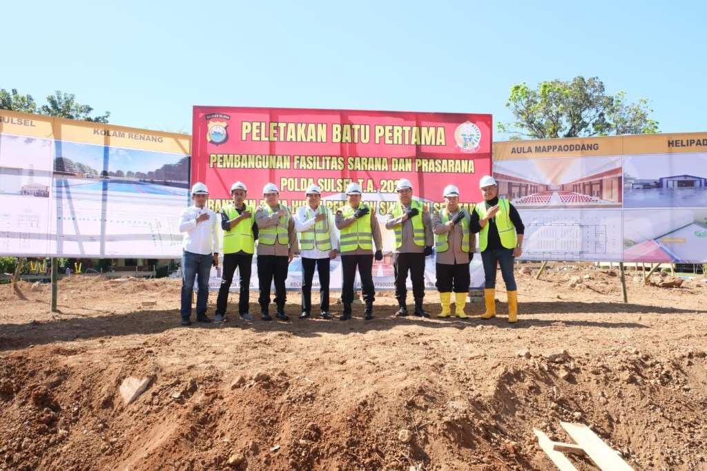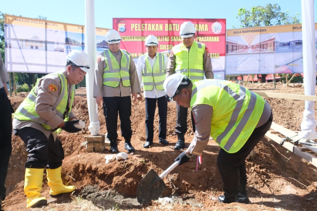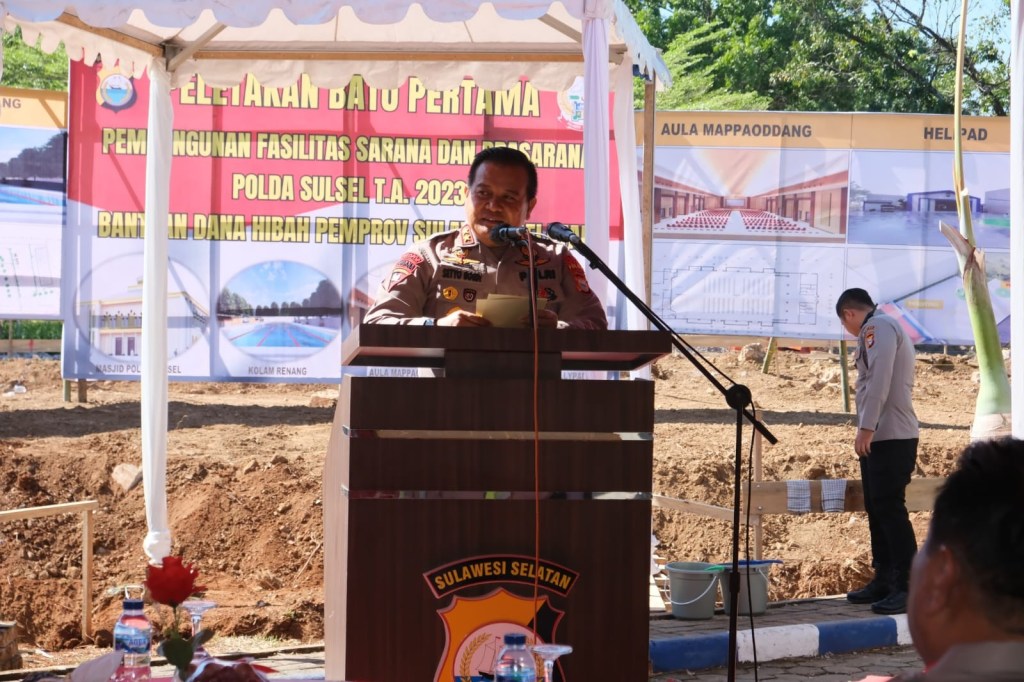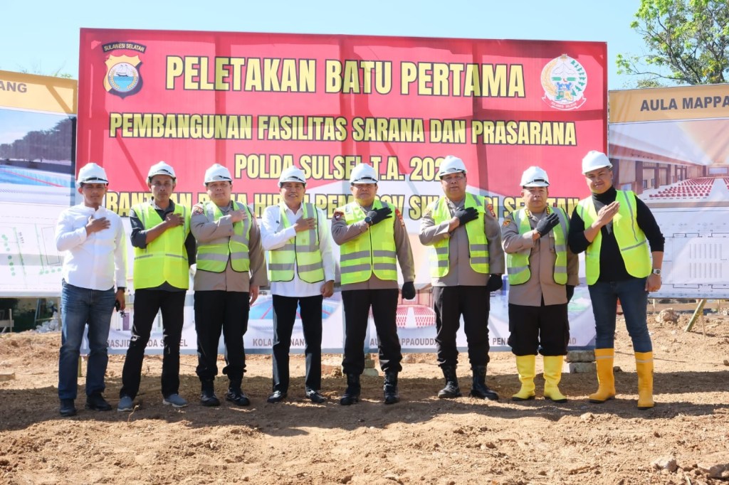 Kapolda Sulsel Irjen Pol Drs. Setyo Boedi Moempoeni Harso, S.H., M.Hum, melakukan peletakan batu pertama pembangunan Masjid Syuhada Mapolda Sulsel, yang berlokasi di dalam area Mapolda Sulsel, Rabu (09/08/2023).