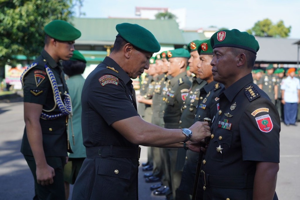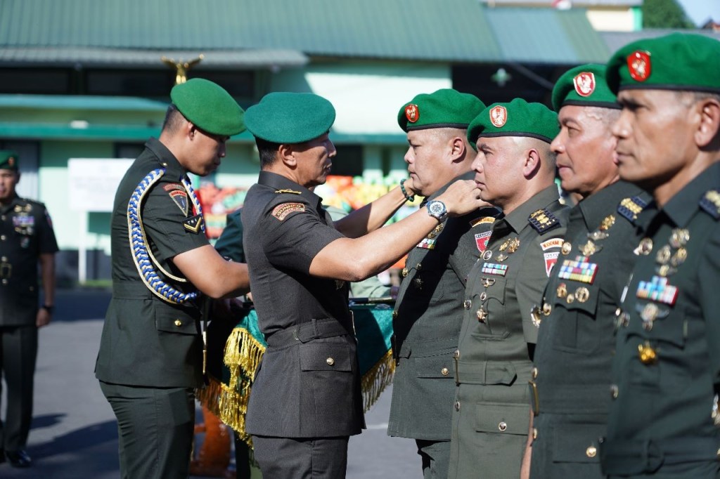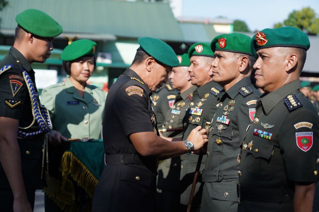 Pangdam XIV/Hasanuddin Mayjen TNI Dr. Totok Imam Santoso, S.I.P., S.Sos., M.Tr. (Han)., memimpin acara Serah Terima Jabatan sejumlah pejabat utama (PJU) dan Tradisi Penerimaan warga baru Kodam, bertempat di lapangan Makodim 1408/Makassar, Kota Makassar. Kamis (10/08/2023).