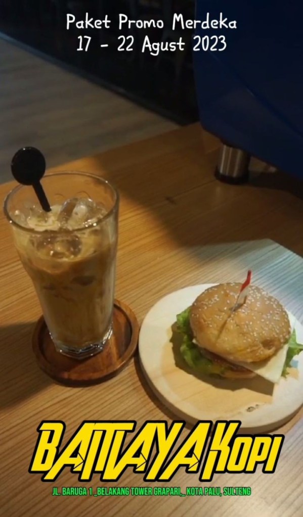 Paket Promo Merdeka yang diadakan oleh BANTAYA Kopi, yang berlokasi di Jl. Baruga 1, belakang Tower GraPARI, Kota Palu, Sulteng, menjadi sebuah rangkaian penawaran istimewa yang bertujuan untuk memanjakan pelanggan dalam rangka perayaan Hari Ulang Tahun (HUT) Kemerdekaan Republik Indonesia yang ke-78 pada tanggal 17 hingga 22 Agustus 2023. Dalam rangka menyambut momen bersejarah ini, BANTAYA Kopi telah menyiapkan beragam promosi menarik yang diharapkan dapat memberikan pengalaman istimewa kepada para pelanggan setia dan juga para pengunjung yang ingin merayakan kemerdekaan negara.