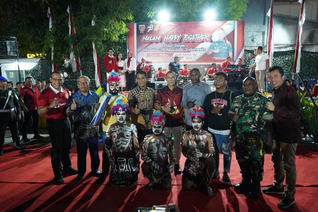 Syukuran dan ramah tamah ini dikemas dalam acara “Malam Happy Together, dalam rangka HUT ke-78 RI, terus melaju untuk Indonesia maju, dihadiri oleh para Pejabat Utama (PJU), sejumlah prajurit dan Ibu-ibu Persit, Awak Media, sejumlah rekanan Kodam XIV/Hasanuddin dan Mahasiswa Papua yang menempuh pendidikan di Makassar.