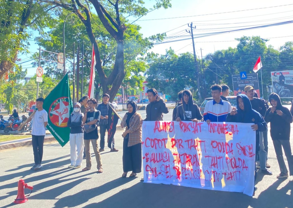Massa aksi yang mengatasnamakan aliansi rakyat indonesia melakukan unjuk rasa di depan markas polda sulsel. Senin, 21 Agustus 2023