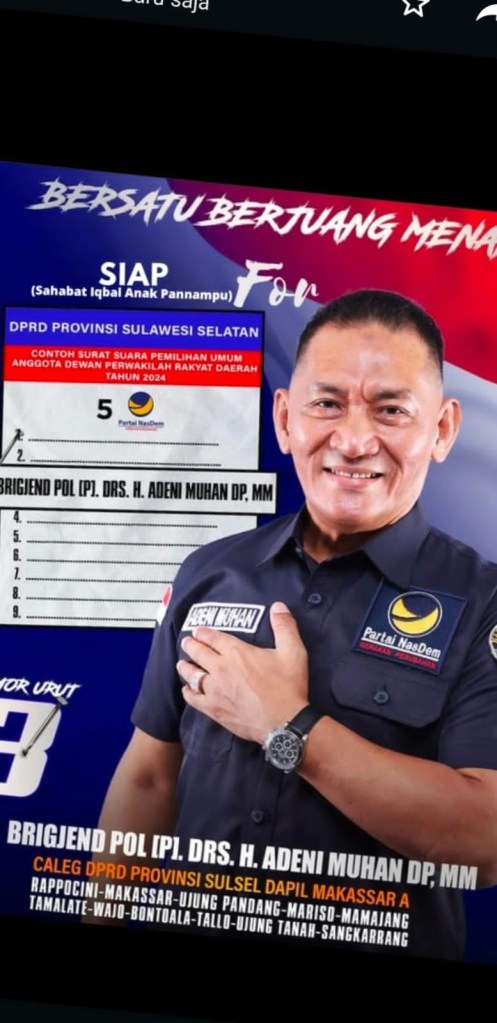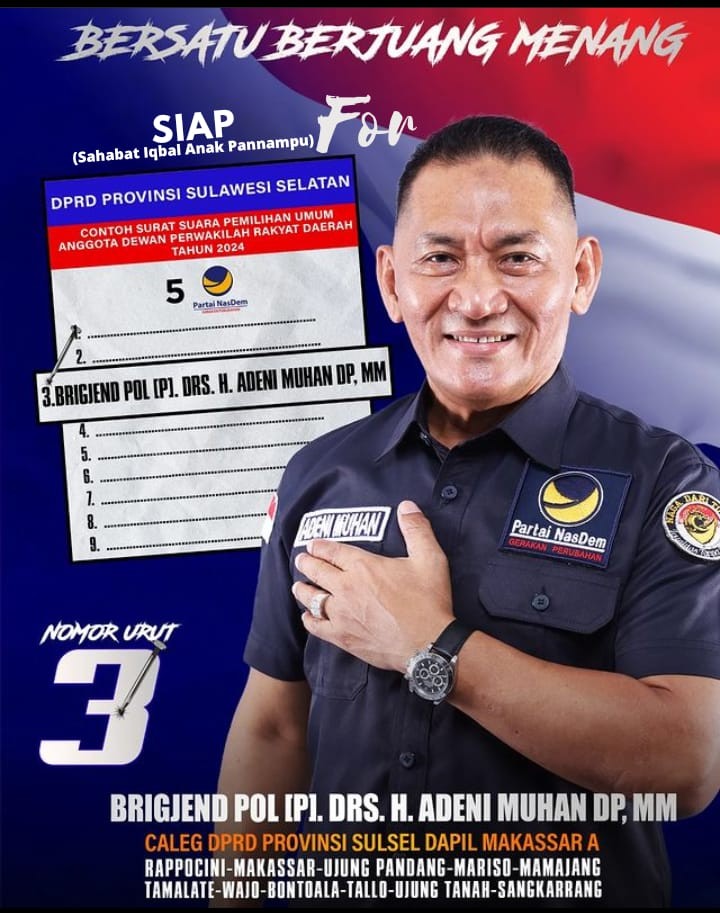 Melihat komposisi yang ada terutama untuk caleg tingkat DPRD prov. Sulsel, Iqbal mengarahkan barisannya yang dikenal dengan barisan SIAP (Sahabat Iqbal Anak Pannampu) untuk mendukung dan memiliih caleg dari partai Nasdem untuk dapil Makassar A bernomor urut 3, yakni Brigjend. Pol (purn). Adeni Muhan DP sebagai calon wakil rakyat nantinya.