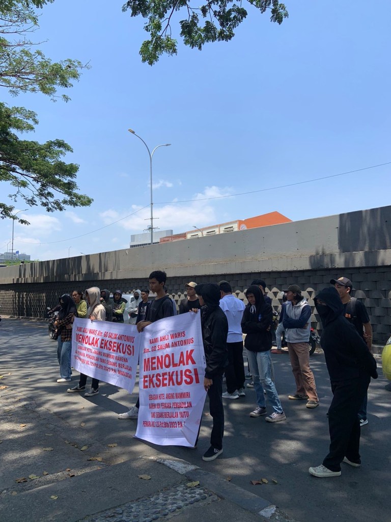 Spanduk yang dibentangkan massa aksi bertuliskan kami ahli waris go salim antonius menolak eksekusi sebagian hotel angin mammiri