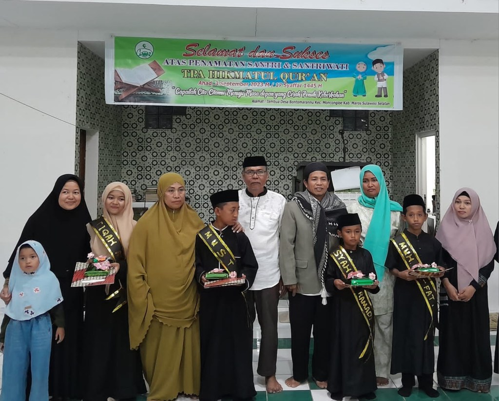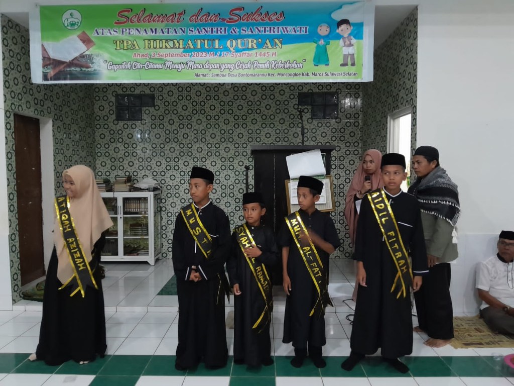 Pada Ahad, 3 September 2023, bertepatan dengan tanggal 17 Syafar 24445 H, di Alamat Jambua, desa Bonto Marannu, kecamatan Moncongloe, kabupaten Maros, Sulsel, telah terselenggaranya acara penamatan santri dan santriwati di TPA HIKMATUL QUR’AN. Acara ini sangat berkesan dan berharga bagi kami.