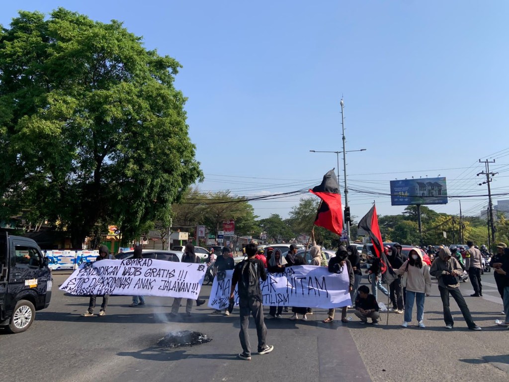 Terlihat massa aksi membentangkan spanduk yang bertuliskan pendidikan wajib gratis dan stop diskriminasi anak jalanan, sembari massa aksi menyampaikan satu persatu orasi ilmiahnya