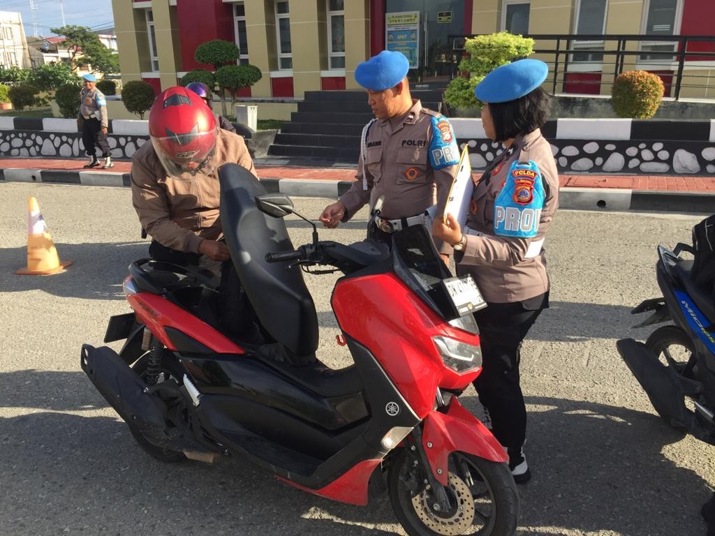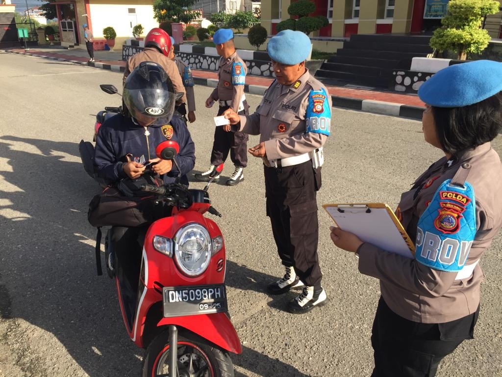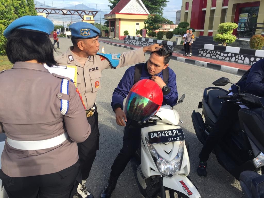Personel Polri dan Aparatur sipil negara (ASN) yang memasuki markas komando (mako) Polda Sulteng secara acak dilakukan pemeriksaan kelengkapan kendaraannya oleh Subbid Provost Bidpropam Polda Sulteng, Rabu (13/9/2023) pagi.