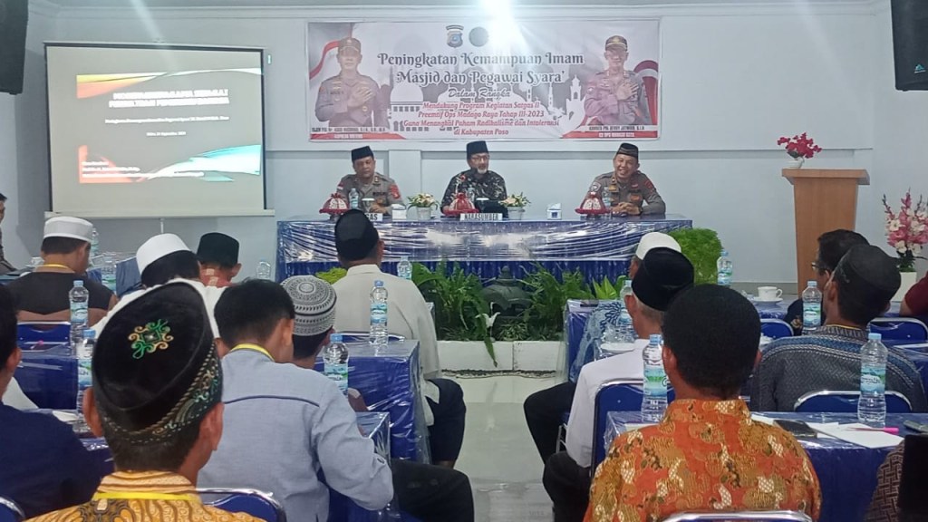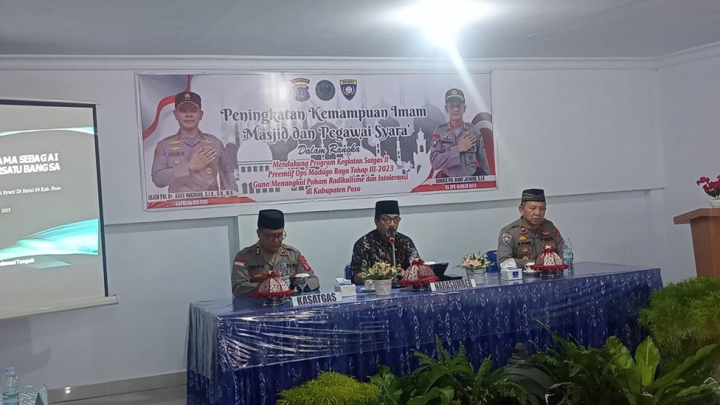 Satuan Tugas (Satgas) Operasi Madago Raya 2023 melalui Satgas II Preemtif menyelengarakan kegiatan peningkatan kemampuan Imam Masjid dan Pegawai Syara, di Aula Hotel 99 kelurahan Gebangrejo Kecamatan Poso Kota Kabupaten Poso Provinsi Sulteng,Sabtu (23/9/2023)