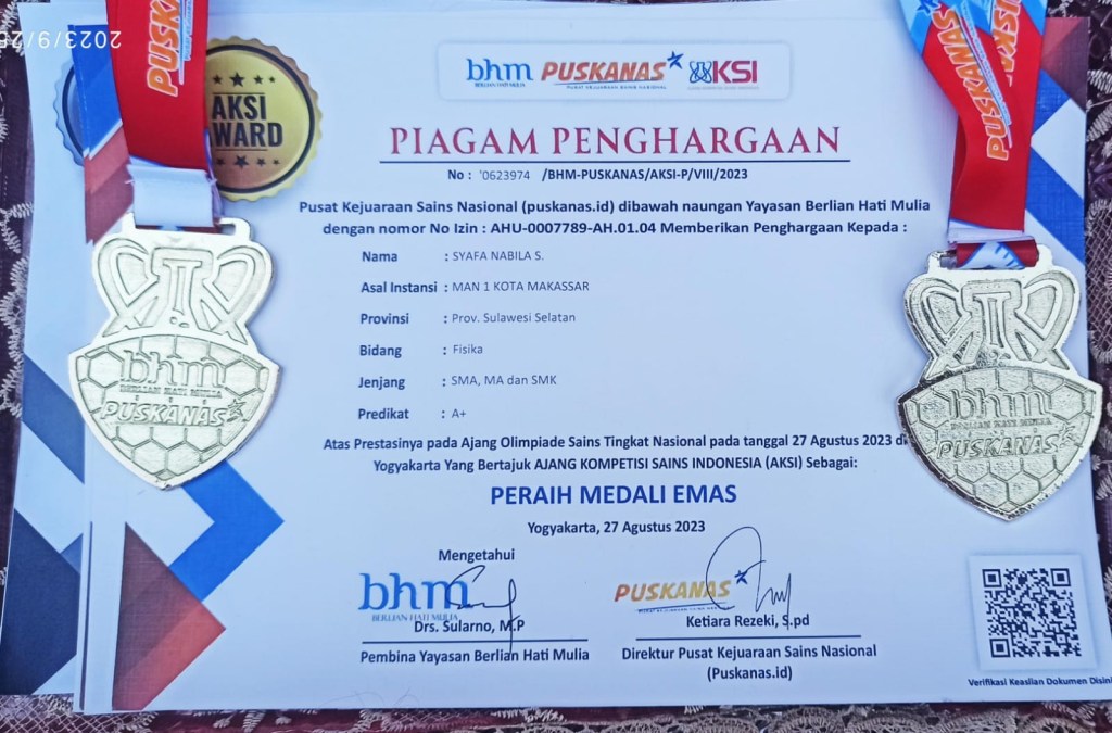 Medali emas MA bidang biologi dan Medali emas MA bidang Fisika diraih oleh Syafa Nabila S. Siswa kelas XI MIPA 1 ini adalah utusan MAN 1 Kota Makassar untuk mengikuti ajang Olimpiade Sains Tingkat Nasional yang diselenggarakan oleh PUSKANAS (Pusat Kejuaraan Nasional).