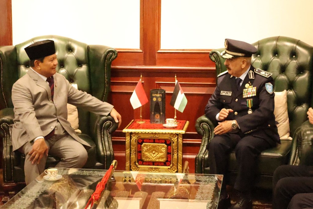 Menteri Pertahanan RI Prabowo Subianto didampingi Wakil Menteri Pertahanan M. Herindra menerima kunjungan kehormatan dari Chief of Palestinian Police H.E. Major General Yousef Helo di Kemhan, Jakarta, Selasa (26/9/2023).
