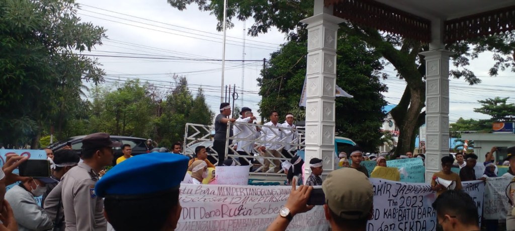 Massa tiba menggunakan mobil pikap membawa pengeras suara dan sejumlah spanduk serta kertas kartun bertuliskan tuntutan. Aksi pertama dilakukan di kantor Sekda,Kantor Bupati hingga gedung DPRD Batu Bara. Sayang, walaupun koordinator aksi dan massa menyuarakan tuntutan, tak satupun pejabat Pemkab Batu Bara berani bertemu massa.