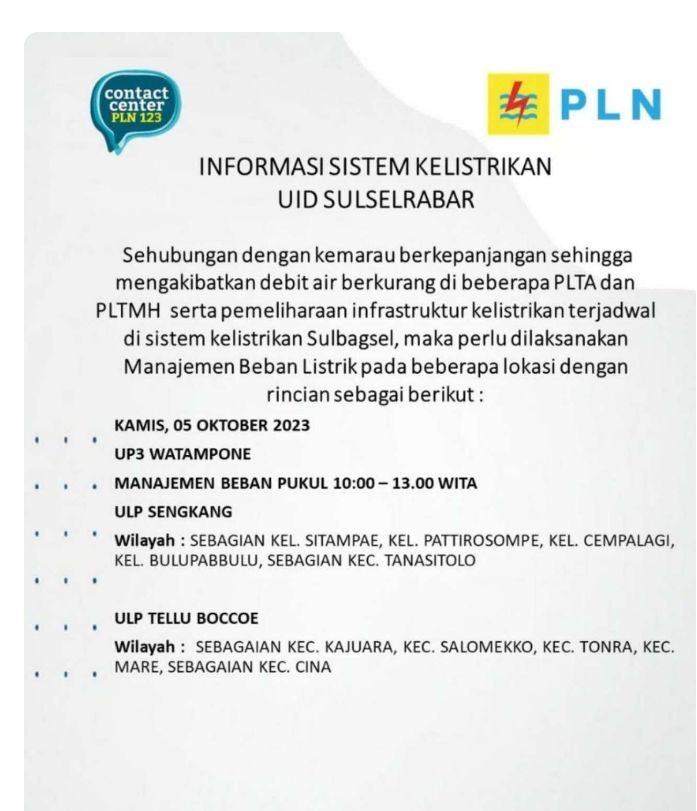 Adapun wilayah dan jadwal pemeliharaan listrik beserta wilayah terdampak berdasarkan informasi yang dirilis oleh PLN Sulselrabar, Kamis 5 Oktober 2023. Kami memohon maaf atas ketidaknyamanannya atas perhatian dan pengertiannya kami ucapkan terima kasih,”demikianlah permohonan maaf yang dituliskan oleh PT PLN Sulselrabar pada Kamis, 5 Oktober 2023.