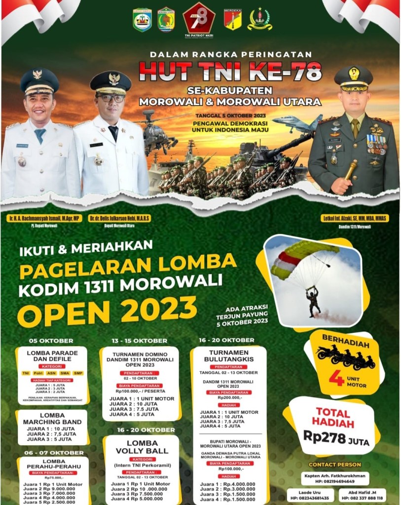 Namun, yang membuat peristiwa ini semakin berkesan adalah lomba utama, yaitu Lomba Kodim 1311 Morowali Open 2023, yang menghadirkan hadiah total senilai 278 juta rupiah. Hadiah utama berupa 4 sepeda motor. Lomba ini mencakup berbagai cabang, seperti Parade & Defile, permainan perahu-perahu, domino, bulu tangkis, dan bola voli.