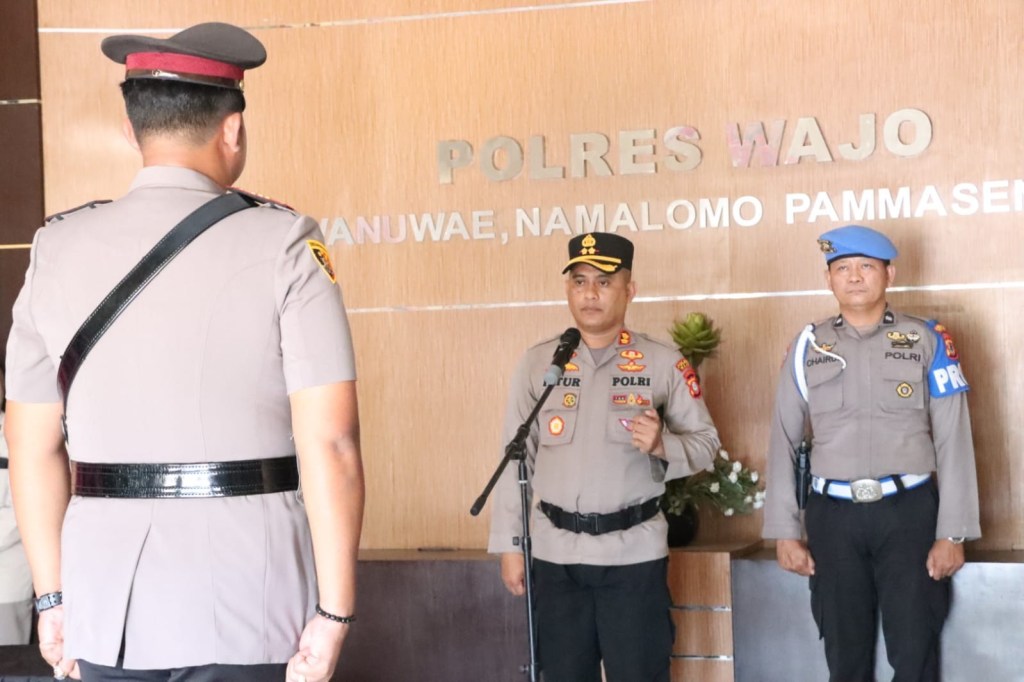 Upacara Penyerahan Jabatan Kasat Reskrim Polres Wajo AKP Theodorus Echeal Setiawan, S.IK.,MH berdasarkan Surat Telegram Kapolri Nomor : ST / 2182 / IX / KEP / 2023 tanggal 26 September 2023 tentang Mutasi Personil dilingkup Polri.