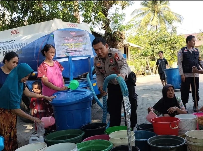 Sebagai bentuk Empati terhadap masyarakat yang sedang mengalami kesulitan air bersih dampak dari El Nino, Polres Takalar melalui Komunitas Tangan Diatas melaksanakan kegiatan bakti sosial dengan memberikan bantuan air bersih kepada warga di dua titik yang terdampak.