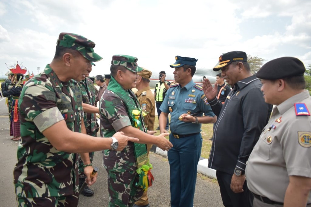 News Lintas Sulawesi/Kendari : Pangdam XIV/Hasanuddin Mayjen TNI Dr. Totok Imam Santoso, S.I.P., S.Sos., M.Tr (Han)., didampingi sejumlah Pejabat Utama (PJU) Kodam dan Korem 143/HO serta unsur Forkopimda Sultra menyambut Kunjungan Kerja (Kunker) Kepala Staf Angkatan Darat (Kasad) Jenderal TNI Dr. Dudung Abdurachman bersama rombongan, bertempat di Lanud Halu Oleo, Kota Kendari. Selasa (10/10/2023).