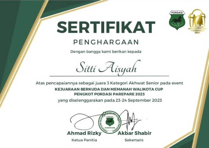 News Lintas Sulawesi/Parepare : Sitti Aisyah meraih prestasi membanggakan sebagai juara 3 dalam kategori Akhwat senior pada Event Kejuaraan Berkuda dan Memanah Walikota Cup yang diselenggarakan oleh Pordasi Parepare pada tanggal 23-24 September 2023. Keberhasilan ini menjadi momen bersejarah dalam karir olahraganya, dan tentunya mendatangkan kebanggaan bagi keluarga dan teman-teman yang telah mendukungnya sepanjang perjalanan ini.