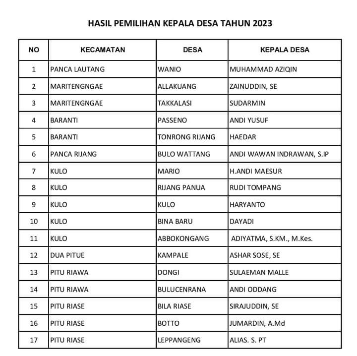 Sebagai hasil dari Pilkades Serentak ini, Kabupaten Sidrap kini memiliki pemimpin-pemimpin baru yang siap membawa harapan dan perubahan positif. Dengan keragaman kepemimpinan ini, diharapkan masyarakat desa-desa Sidrap akan mengalami perkembangan yang lebih baik dalam beberapa tahun ke depan. Pilkades Serentak tahun 2023 adalah tonggak penting dalam sejarah demokrasi lokal, dan telah membuka jalan menuju masa depan yang lebih cerah bagi seluruh masyarakat di kabupaten ini.