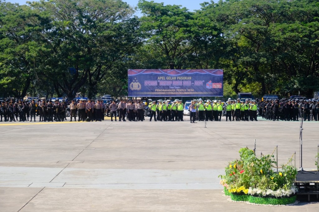 Polda Sulawesi Selatan menggelar Apel Gelar Pasukan Operasi Mantab Brata 2023-2024 dalam rangka Pengamanan Pemilu 2024 di Lapangan Karebosi Kota Makassar, Selasa (17/10).