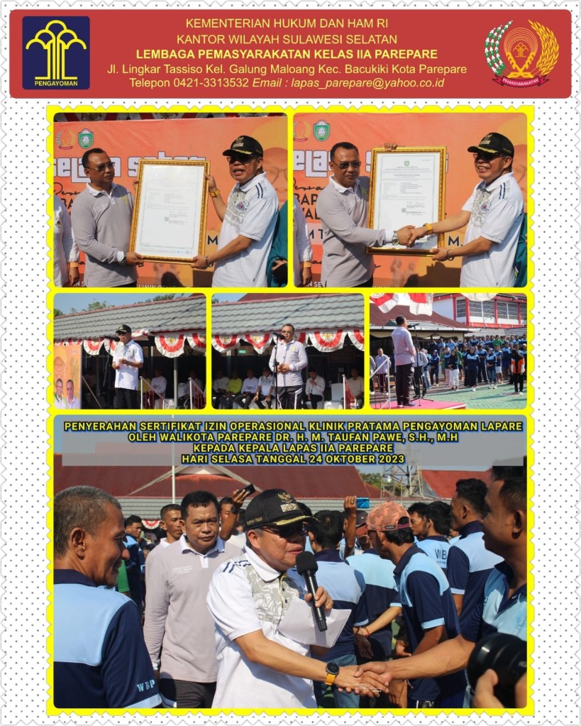 News Lintas Sulawesi/Parepare, 24 Oktober 2023 : Bertempat di Lapas IIA Parepare dilaksanakan kegiatan olah raga bersama, pemeriksaan kesehatan gratis dari Puskesmas Lompoe dan budaya gemar membaca yang diselenggarakan oleh Dinas Perpustakaan Kota Parepare dengan tema SELASA SEHAT BERSAMA WALIKOTA PAREPARE. Kegiatan ini sekaligus dirangkaikan penyerahan Sertifikat Izin Operasional Klinik Pratama Pengayoman Lapare Lapas IIA Parepare oleh Walikota Parepare Dr. H. Muhammad Taufan Pawe, S.H., M.H Kepada Kepala Lapas IIA Parepare Totok Budiyanto Amd.IP, SH. Sertifikat Izin Operasional Klinik Pratama Pengayoman Lapare Nomor : 3/IOK/DPM-PTSP/10/2023 Tanggal 23 Oktober 2023 dikeluarkan oleh Kepala Dinas Penanaman Modal Dan Pelayanan Terpadu Satu Pintu Kota Parepare Propinsi Sulawesi Selatan Hj. ST. Rahmah Amir, ST, MM. Sebelumnya Dinas Kesehatan Kota Parepare sebagai pemberi rekomendasi telah melakukan pengecekan seluruh persyaratan administrasi maupun substantif dan visitasi langsung di lapangan, dengan hasil Lapas IIA Parepare telah memenuhi syarat untuk diberikan rekomendasi Izin Operasional Klinik Pratama. Dengan terbitnya Izin Operasional Klinik Pratama Pengayoman Lapare kini telah memiliki dasar legalitas untuk menyediakan pelayanan kesehatan yang memadai bagi warga binaan berdasarkan undang-undang yang berlaku. Dimana langkah ini diambil dalam upaya meningkatkan standar perawatan dan pemeliharaan kesehatan di dalam lembaga pemasyarakatan. Kepala Lapas IIA Parepare menegaskan bahwa setiap warga binaan pemasyarakatan berhak untuk mendapatkan pelayanan kesehatan yang layak, hal ini tertuang dalam Undang-Undang Nomor 22 Tahun 2022 tentang Pemasyarakatan pada Pasal 9. Hal tersebut memberikan kepastian hukum terhadap kewajiban memberikan pelayanan seoptimal mungkin agar tujuan Pemasyarakatan tercapai.