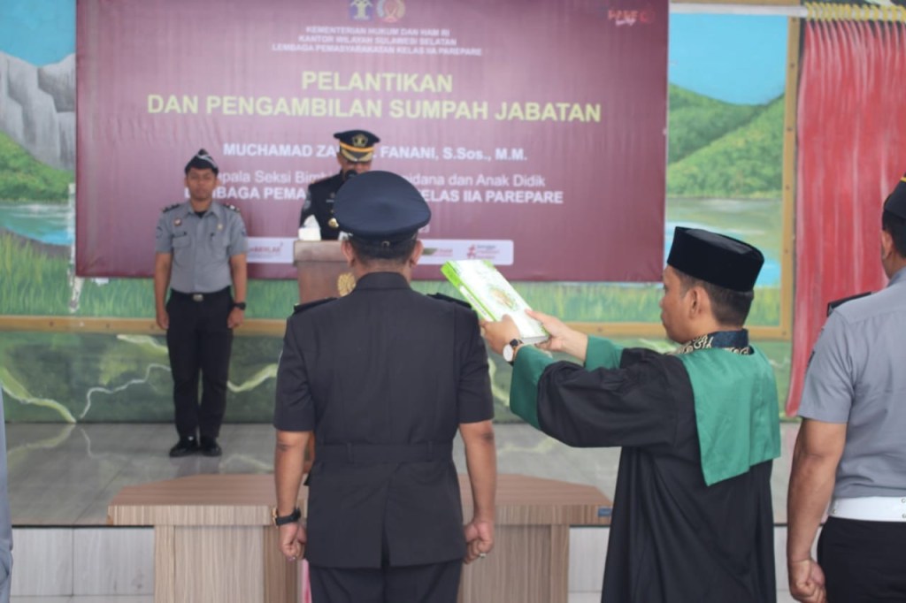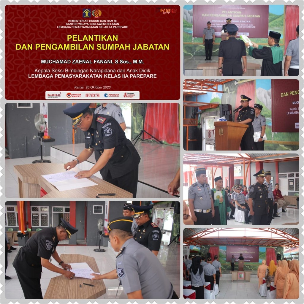 News Lintas Sulawesi/Parepare, 26 Oktober 2023 : Bertempat di Lapas IIA Parepare telah dilaksanakan kegiatan Pelantikan Dan Pengambilan Sumpah Jabatan 1 orang pejabat Administrasi, berdasarkan Surat Keputusan Menteri Hukum dan Hak Asasi Manusia Republik Indonesia Nomor : M.HH-29.KP.03.03 Tahun 2023 tanggal 6 Oktober 2023 tentang Pemberhentian dari Jabatan Administrasi Dan Jabatan Fungsional serta pengangkatan dan pemindahan dalam jabatan administrasi di lingkungan Kementerian Hukum Dan Hak Asasi manusia. Bersama ini dengan hormat, kami memohon agar diutus seorang Pejabat / Staf.