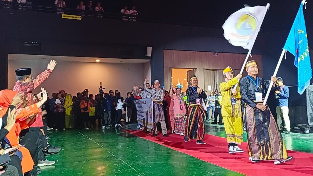 News Lintas Sulawesi/Jakarta (Humas Sulsel) : Barisan Kontingen Pesta Paduan Suara Gerejani (Pesparani) Katolik Nasional III Provinsi Sulawesi Selatan yang diisi 70 orang peserta dan diiringi lagu Anging Mamiri tampak penuh semangat dalam balutan pakaian adat khas suku suku yang mendiami Sulawesi Selatan melintas di depan panggung Kehormatan.