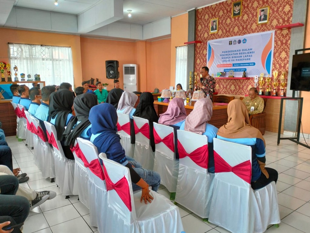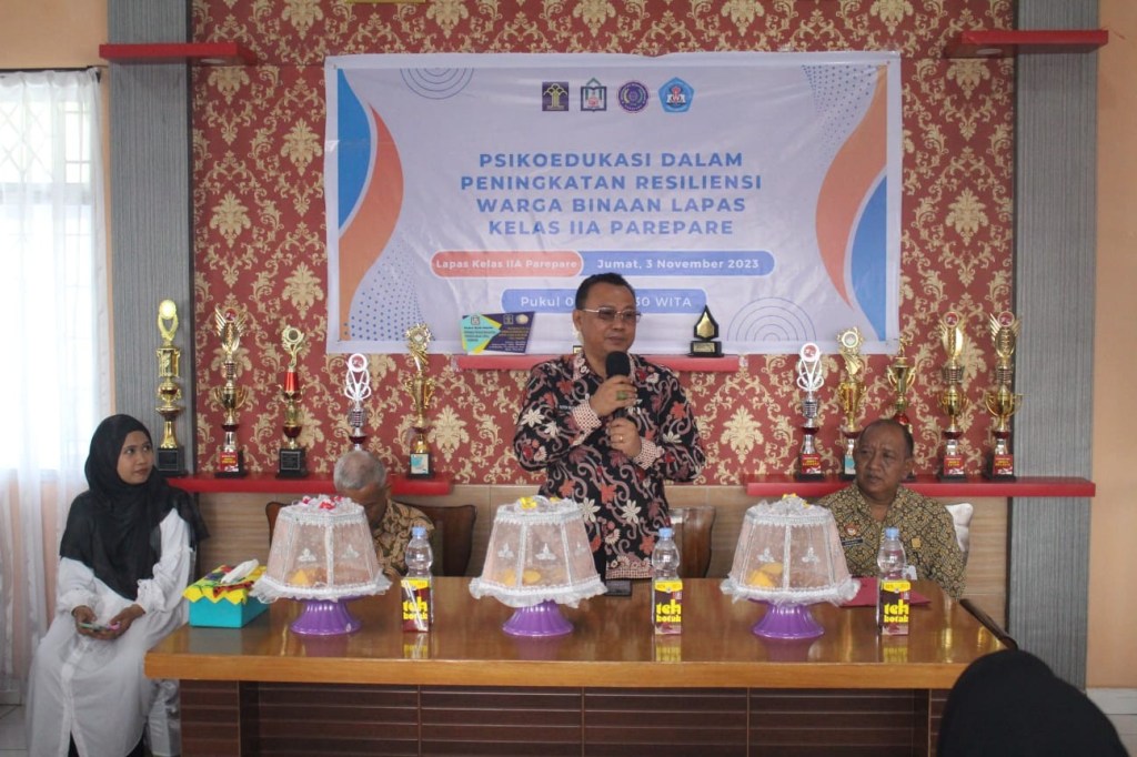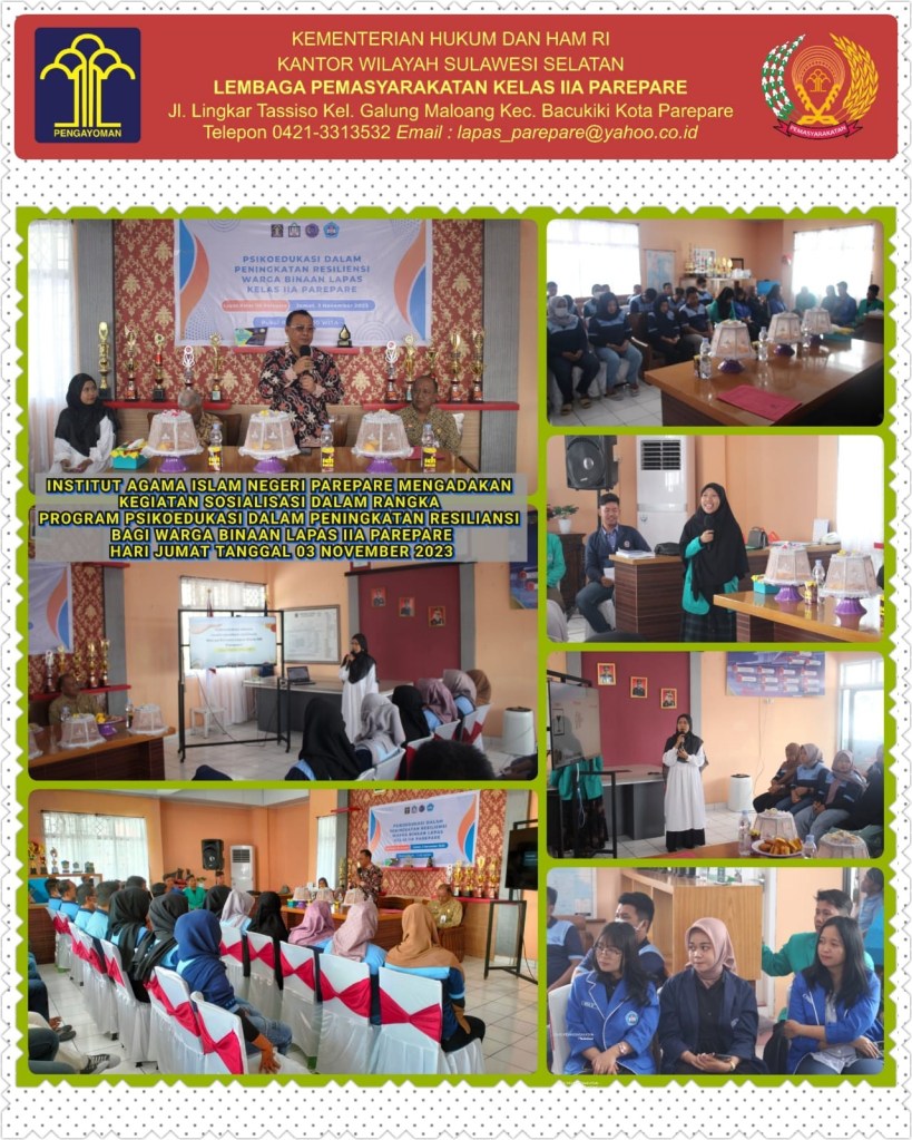 News Lintas Sulawesi/Parepare, 03 November 2023 : Bertempat di ruang rapat Lapas IIA Parepare telah dilaksanakan kegiatan Sosialisasi Program Psikoedukasi Dalam Meningkatkan Resiliansi Bagi Warga Binaan Pemasyarakatan yang diselenggarakan oleh Institut Agama Islam Negeri Parepare. Kegiatan dibuka langsung oleh Kepala Lapas IIA Parepare Totok Budiyanto, Amd.IP, SH. Hadir dalam pembukaan kegiatan sosialisasi tersebut :