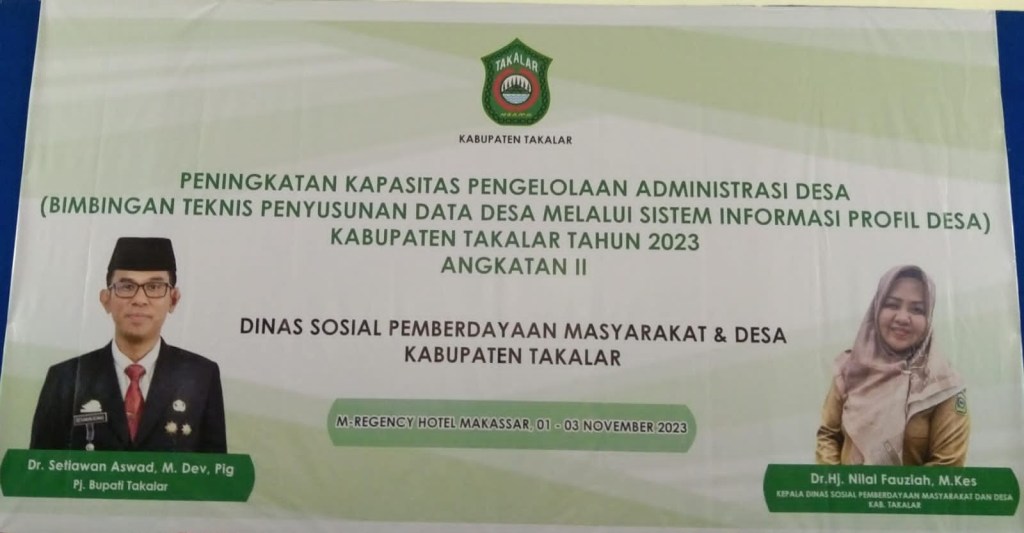 News Lintas Sulawesi/TAKALAR : Pj. Bupati Kabupaten Takalar Dr. Setiawan Aswad, M.Dev, Plg didampingi Kepala Bidang Pembinaan Pemerintahan Desa Dinas Sosial dan PMD Kab. Takalar dr. Nilal Fauziah membuka secara resmi Bimbingan Teknis Penyusunan Data Desa Dalam Sistem Informasi Profil Desa Kab. Takalar Tahun 2023, bertempat Di Hotel M-Regency Jl. Dg. Tompo Makassar, Rabu (01/11/2023).