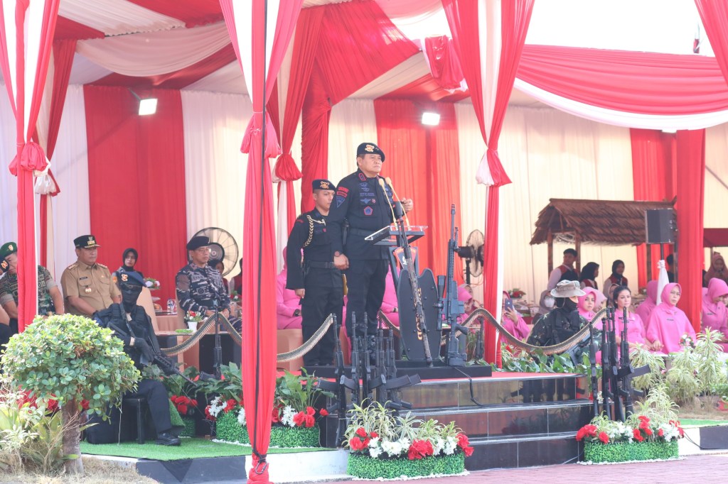Kapolda Sulsel Irjen Pol Drs. Setyo Boedi Moempoeni Harso, S.H., M.Hum, memimpin Upacara peringatan HUT Korps Brimob Polri ke-78 di Lapangan Upacara Mapolda Sulsel, Kamis (15/11/2023).