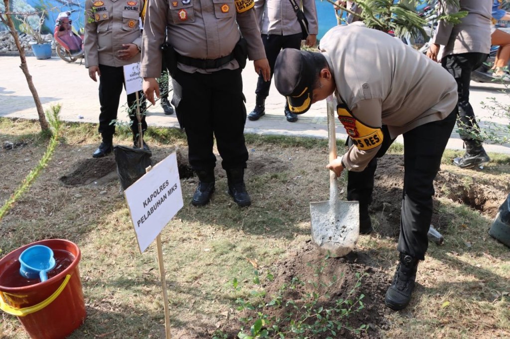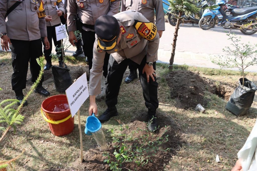 News Lintas Sulawesi/HUMDER : Sebagai upaya penghijauan, Kapolres Pelabuhan Makassar AKBP Yudi Frianto melakukan penanaman pohon di Pulau Barrang Lompo kecamata Kepulauan Sangkarrang Kota Makassar.