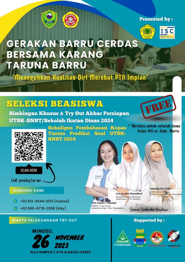 News Lintas Sulawesi/MAKASSAR : Karang Taruna Barru akan menggelar Try Out akbar bekerjasama bimbel ISC dan STIA Algazali Barru dilaksanakan Minggu, 26 November 2023 di aula STIA Al gazali Barru.