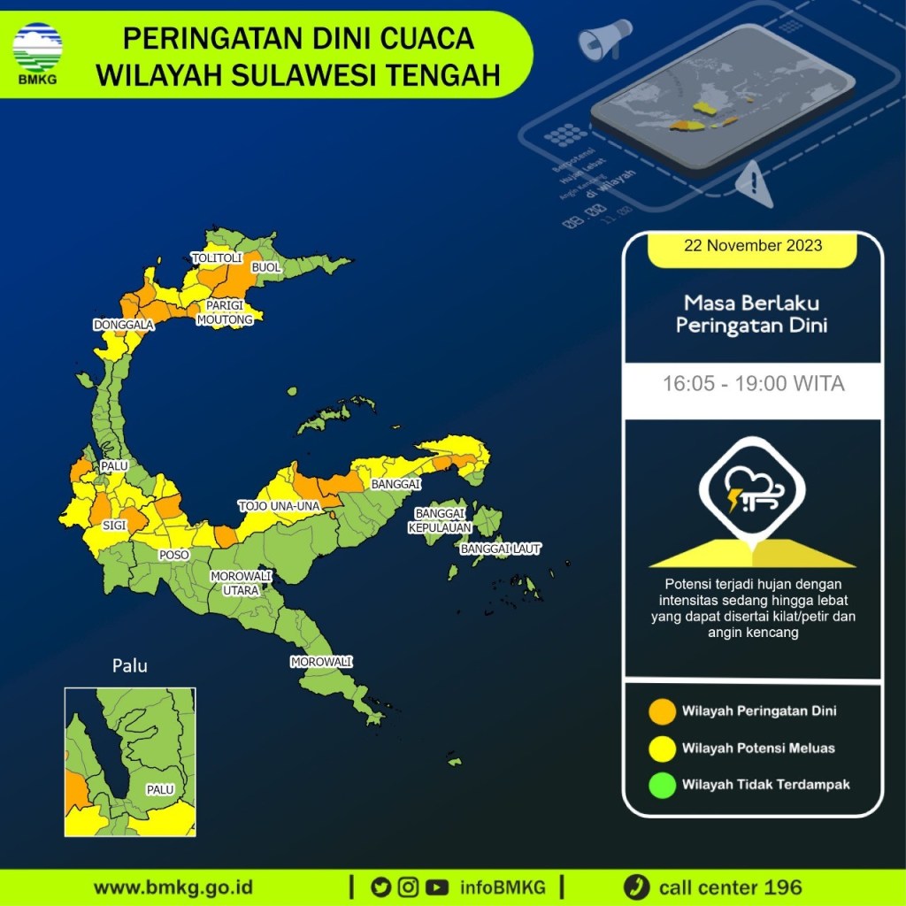 Dilalansir News Lintas Sulawesi Rabu (22/11-2023), Adapun UPDATE Peringatan dini cuaca di wilayah Sulawesi Tengah pada tgl 22 November 2023 pkl. 15:53 WITA masih berpotensi terjadi hujan dengan intensitas sedang hingga lebat yang dapat disertai kilat/petir dan angin kencang
