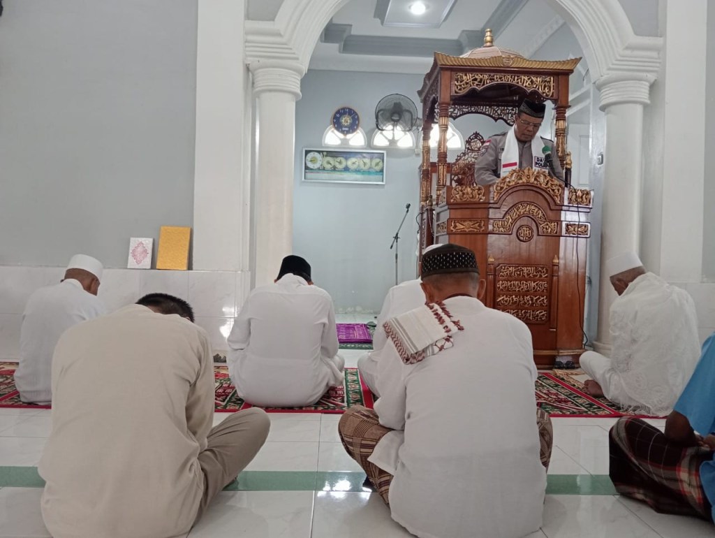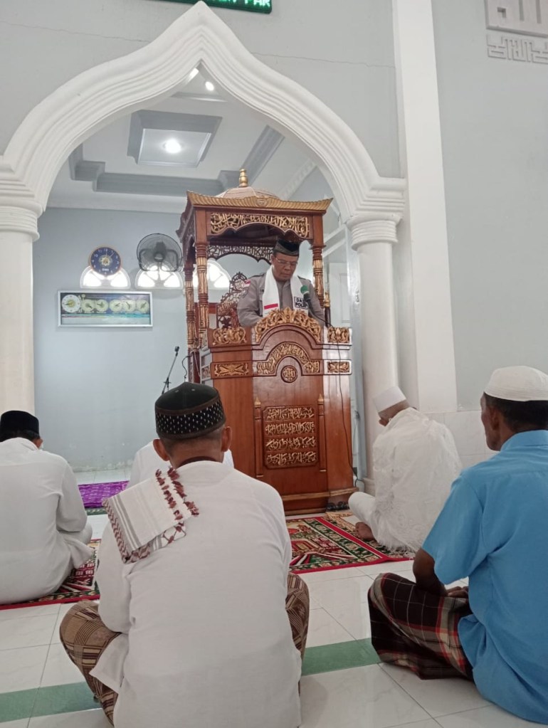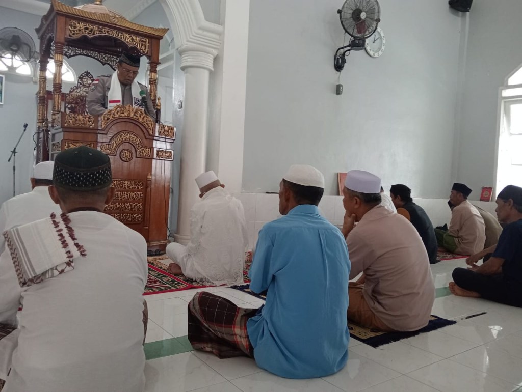 Dai Polri Aiptu Irwan bertindak selaku Khotib pada sholat Jumat di Masjid Amalia Dusun 2 Desa Bambalemo Kecamatan Parigi Kabupaten Parimo Provinsi Sulawesi Tengah.Jumat,24/11/2023.