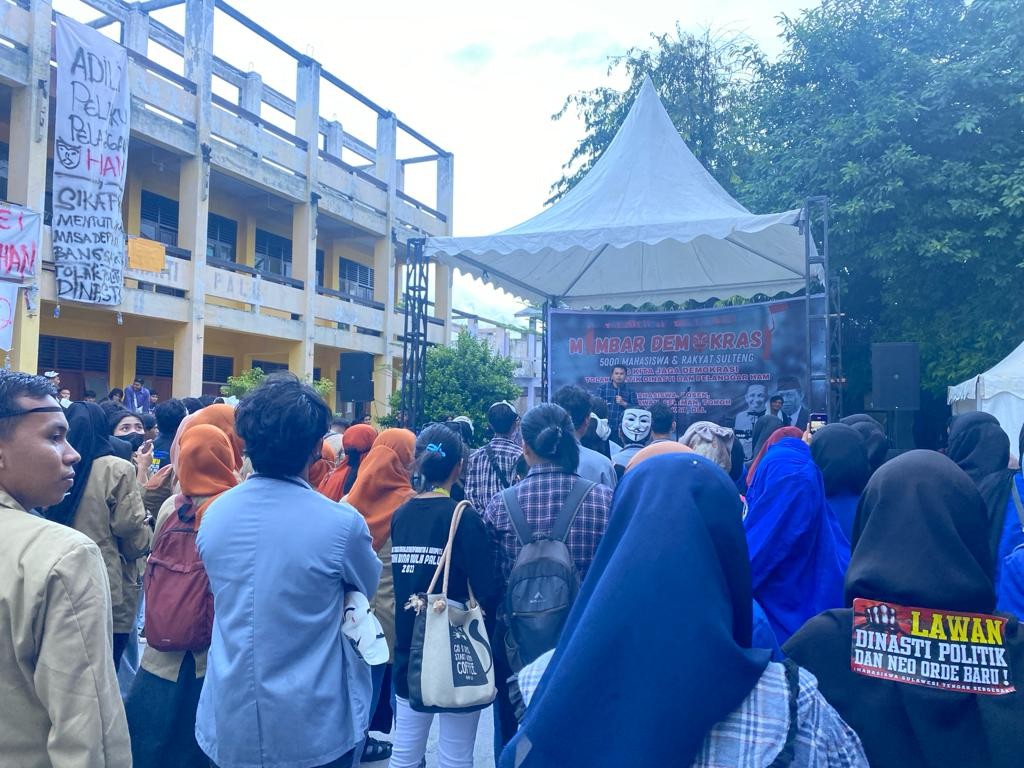 Ribuan mahasiswa dan rakyat menggelar Mimbar Demokrasi di halaman kampus Unazlam Palu, Jumat (01/12/2023).