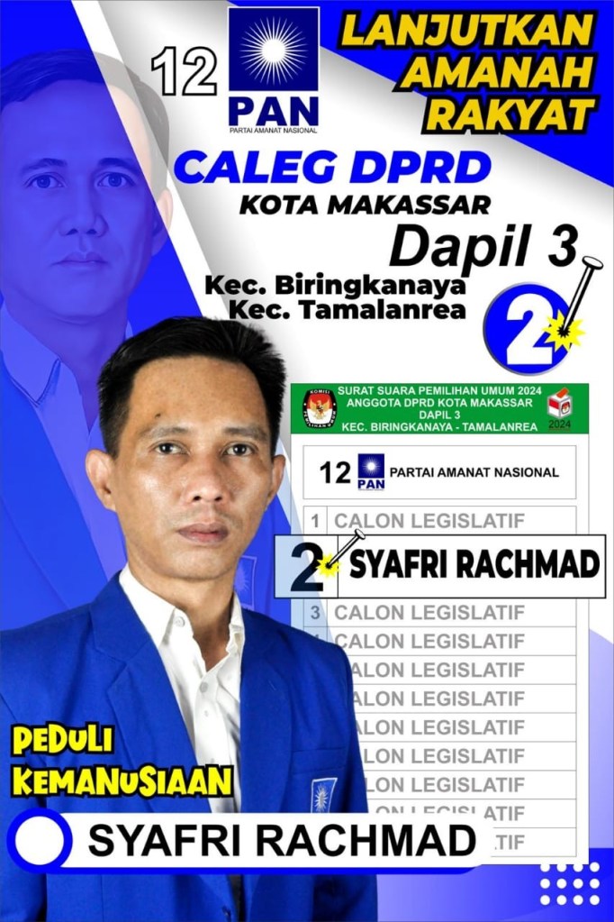 Calon Legislatif Nomor Urut 2 dari Partai PAN, Bpk. Syafri Rahmad, aktif melaksanakan sosialisasi di wilayah Dapil 3 Biringkanayya Tamalanrea. Dengan semangat “Lanjutkan Amanah Rakyat dengan Peduli Kemanusiaan,” beliau telah berhasil membangun citra sebagai pemimpin yang selalu siap menfasilitasi warga dengan pelayanan ambulance gratis selama 5 tahun terakhir.