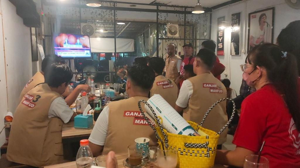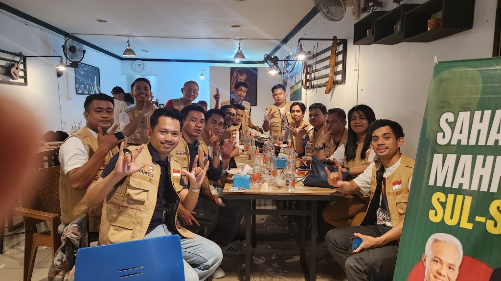 News Lintas Sulawesi/Makassar, 22 Desember 2023 : bertempat di Warkop Cafein bilangan jalan Ratulangi Makassar Relawan Sahabat Mahfud Sulsel sukses besar menggelar nonton bareng Debat Capres – Cawapres yang di selenggarakan oleh KPU RI yang di siarkan oleh stasiun TV ternama dan Live streaming melalui saluran internet.