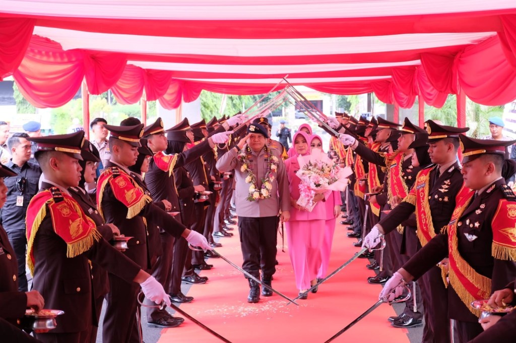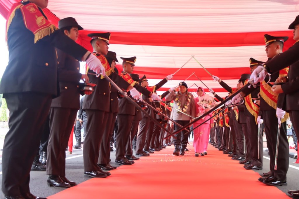 Setelah pengalungan bunga, Irjen Pol Drs. Setyo Boedi Moempoeni Harso, S.H., M.Hum., beserta Ny. Yuni Setyo Boedi didampingi Kapolda Sulsel Irjen Pol Andi Rian R.Djajadi dan Ketua Bhayangkari Daerah Sulsel Ny. Dewwy Andi Rian selanjutnya diiringi dengan lingkaran pedang pora (payung pora) mulai meninggalkan selangkah demi selangkah Polda Sulsel.