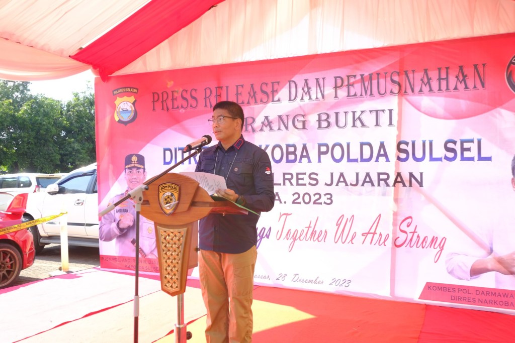 Kabidhumas Polda Sulsel Kombes Pol Komang Suartana bersama Dirresnarkoba Polda Sulsel Kombespol Darmawan Affandy menggelar Press Release Pengungkapan Kasus Tindak Pidana Narkoba di wilayah hukum Polda Sulsel Tahun 2023 Periode Januari-November, di Mapolda Sulsel, Kamis (28/12)